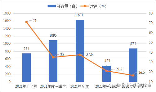 上半年,中欧班列(中豫号)累计开行875班、增长16.5%,新开通布达佩斯、乌兰巴托等站点,形成了直达欧盟和俄罗斯、中亚、东盟地区的7个口岸出入境、16条线路直达的集疏体系;自2013年7月18日首班中欧班列开行以来,总累计开行超6000列、货重近400万吨,实现每周16列去程、18列回程的高频次往返对开模式,培育了恒温班列、数字班列等河南特色品牌,班列重箱率、回程比例、综合运营能力等6项指标均居全国前列。
